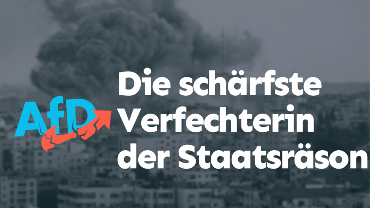 Die AfD ist die stärkste Verfechterin der Staatsräson und der israelischen Politik und offenbart damit nicht nur, dass sich fanatische Unterstützung für Israel und massiver Antisemitismus keinesfalls ausschließen, sondern ebenfalls den durch und durch reaktionären Charakter des Zionismus. Die auch von Baerbock und Scholz hochgehaltene und von sogenannten „Ideologiekritikern“ vergötterte Staatsräson findet ihre militanteste Verteidigerin genau dort: in der äußersten Reaktion, bei AfD, NPD und anderen rechtspopulistischen bis faschistischen Kräften.
